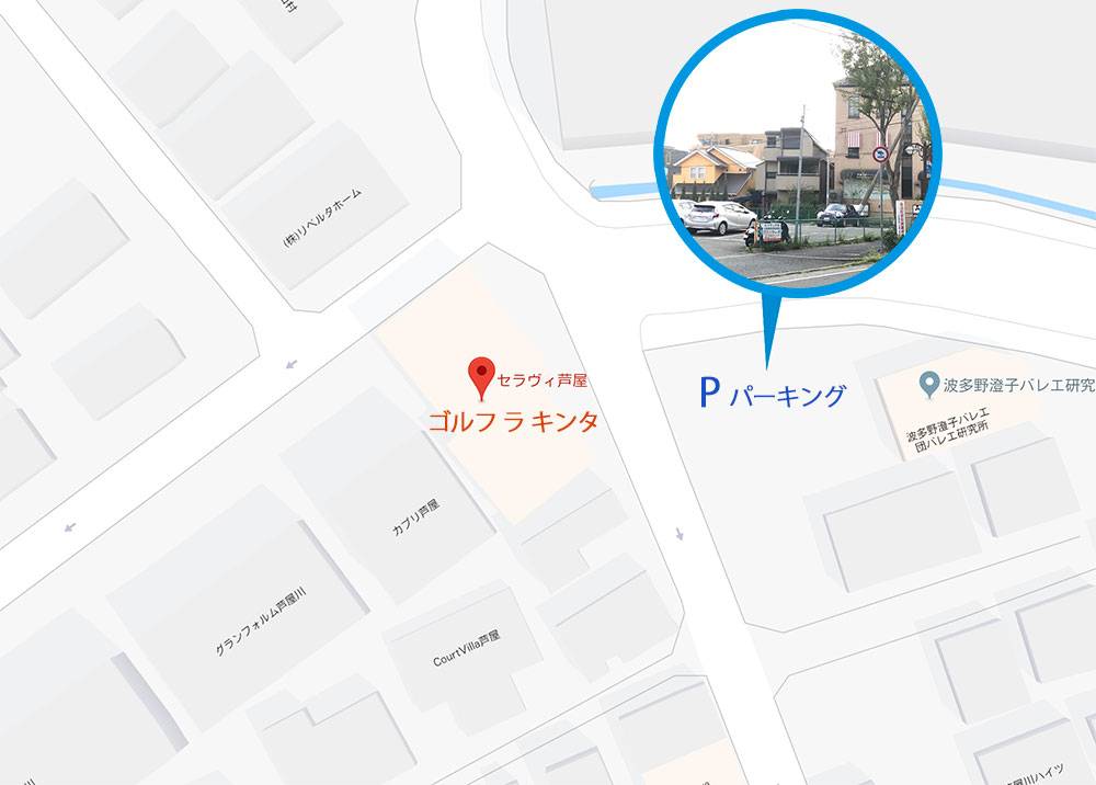 セラヴィ芦屋の道を挟んだ向かい側(東側)に共有駐車場が10台分ございます。【黄色い枠線内にお止めください。】